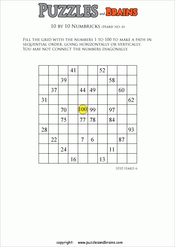 Printable 10 By 10 Difficult Level Numbrix Logic Puzzles For Kids And
