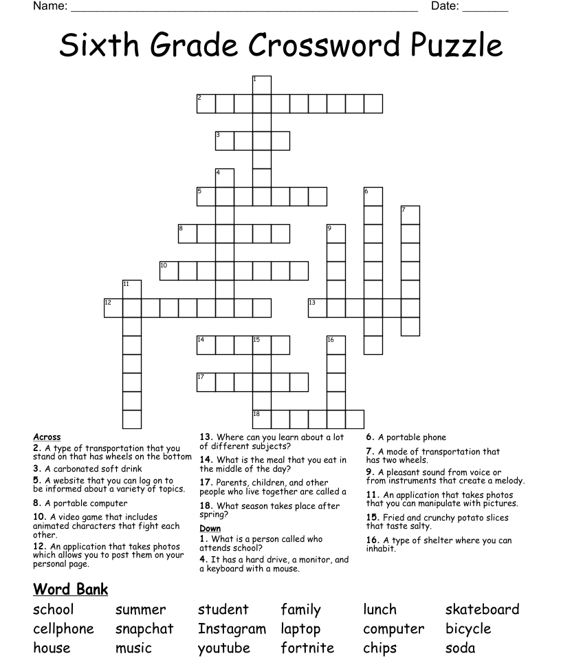 Printable Crossword Puzzle Grade 6 – What is the best way to solve a crossword? How do you solve them quick? Here are some suggestions to help you out. Remember that duplicate words can ruin the puzzle. The solution is to “regenerate” the puzzle. This method might not work for all puzzles. It might take some time to complete the puzzle before finding an answer. You can also buy an answer manual to make the puzzles more challenging and enjoyable.